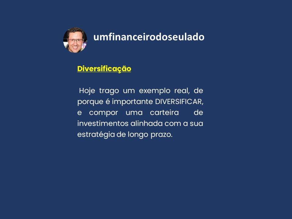 Meu objetivo é fazer você refletir sobre “Diversificação”, e ser um financeiro do seu lado, compartilhando aprendizados e experiências.