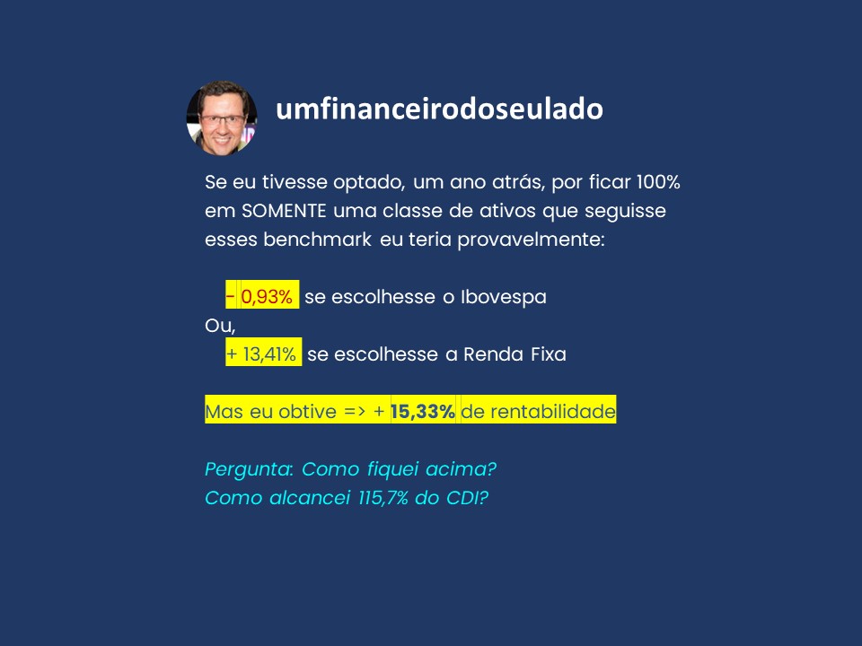 Minha intenção, com esse post, não é recomendar nenhuma carteira que te garanta resultados acima do CDI ou do Ibovespa.