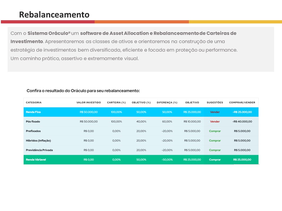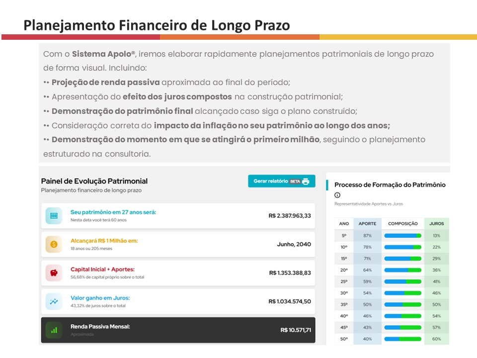 Nesse sentido, é mais que um relatório, é a consolidação de todo um projeto, centrado em um único objetivo: elaborar uma orientação específica e direta para VOCÊ. Sim, para você, porque entendo que as orientações de investimentos NÃO podem ser genéricas, como muitos tratam no mercado. Estou cansado de encontrar clientes com aplicações em produtos que não sabem a composição, ou não se encaixam em nenhum de seus objetivos.
