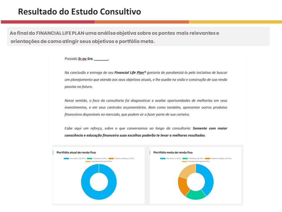 O Financial Life Plan nasceu da necessidade de consolidar todos os aspectos tratados em minha consultoria financeira. Ele é fruto da observação sobre as dificuldades que a maioria das pessoas tem em se planejar, e realizar escolhas de investimentos alinhadas com os seus objetivos. E, mais que isso, que estejam alinhadas com a estratégia de alcance de sua independência financeira e de busca de formação de renda passiva.